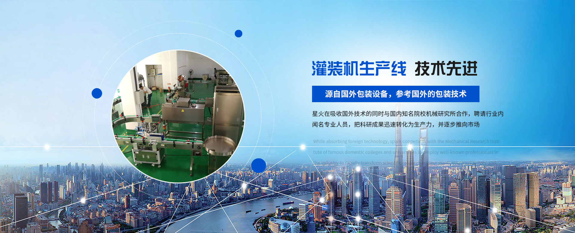 源自國外包裝設備,參考國外的包裝技術,與國內知名院校機械研究所合作。灌裝機等設備已擁有十多項產品知識產權和專利技術